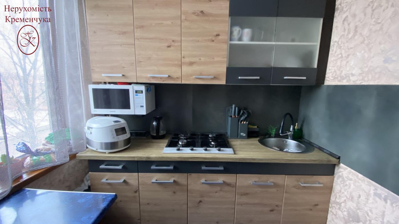Кухня обладнана газовою варильною поверхнею та вбудованими меблями.